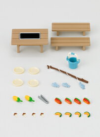 シルバニアファミリーの家具シリーズファミリーバーベキューセットテーブルの中央にはバーベキューコンロが付いてるから、野菜やつった魚を料理できるね。4人分の食器や野菜、ホットドック、釣り竿やバケツも入っているよ。